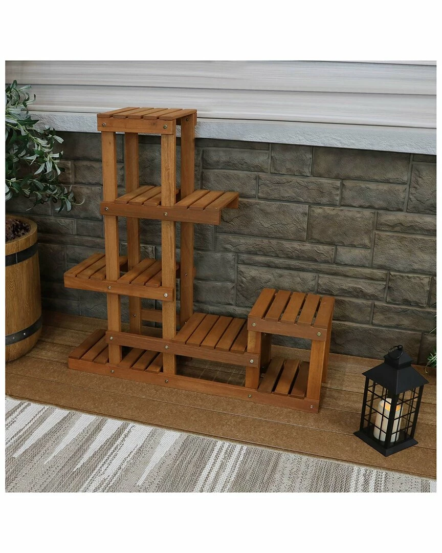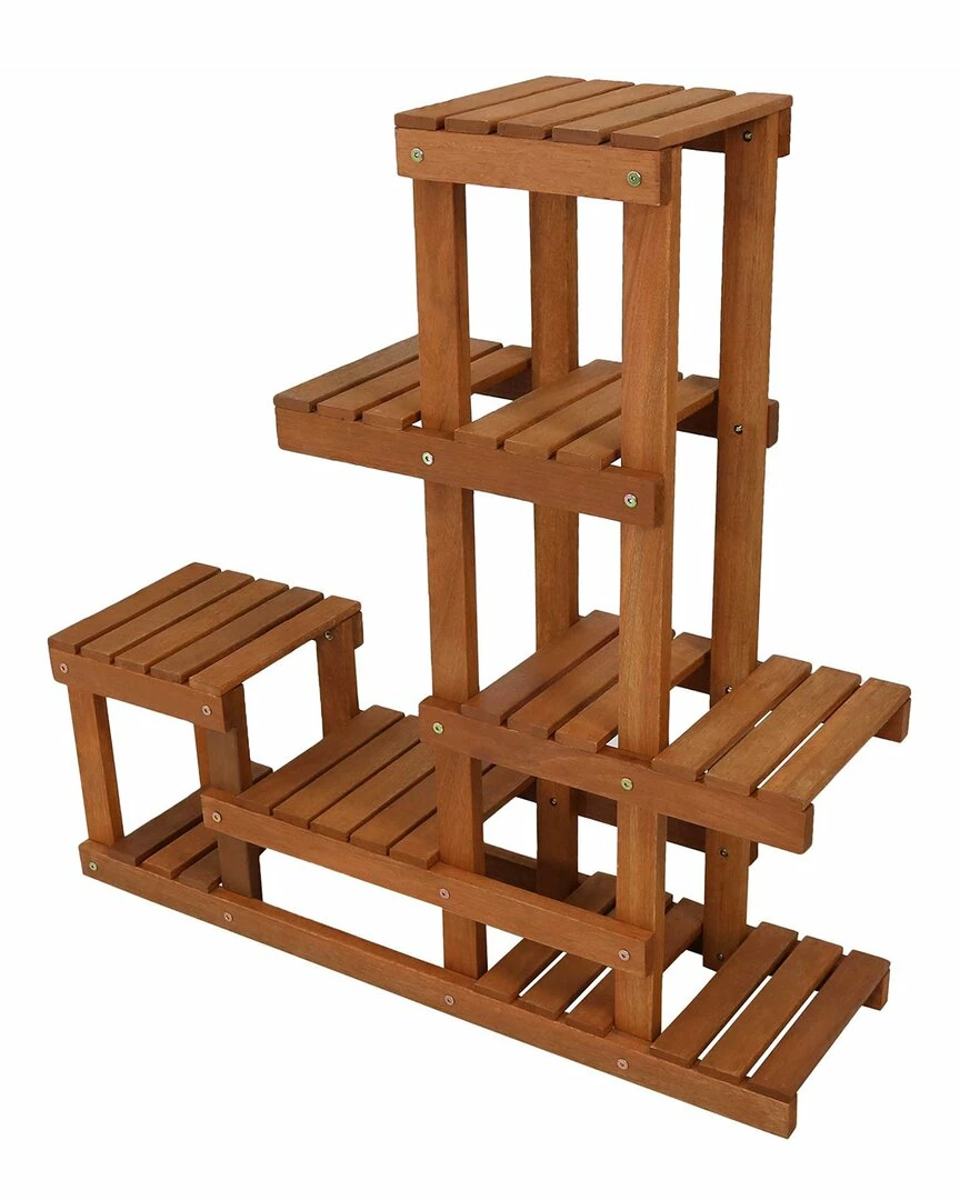 - STURDY PLANT STAND: Multi-tiered plant stand is constructed of solid meranti wood with an attractive teak oil finish; Ideal for displaying plants and outdoor decor on patio, deck, balcony and anywhere else you want to show off your green thumb; Multiple p