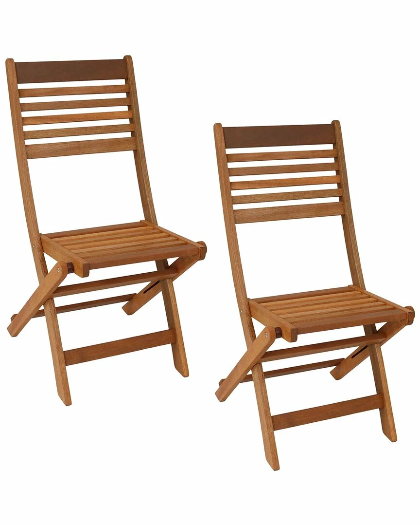 - Add comfortable seat ing to any outdoor living space with the Meranti Wood Outdoor Folding Patio Chairs from Sunnydaze Decor. This set of two chairs features classic, minimal styling that complements a variety of outdoor furniture and decor. Both of the chairs are constructed of meranti wood that has a teak oil finish that enhances the natural beauty of the material. These lightweight outdoor chairs do not require any assembly. They can simply be unfolded right out of the box and they are ready to be used.