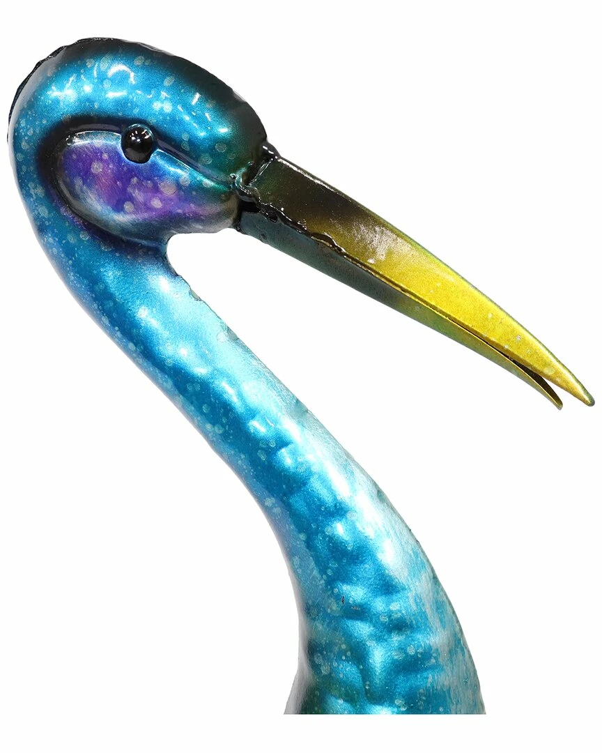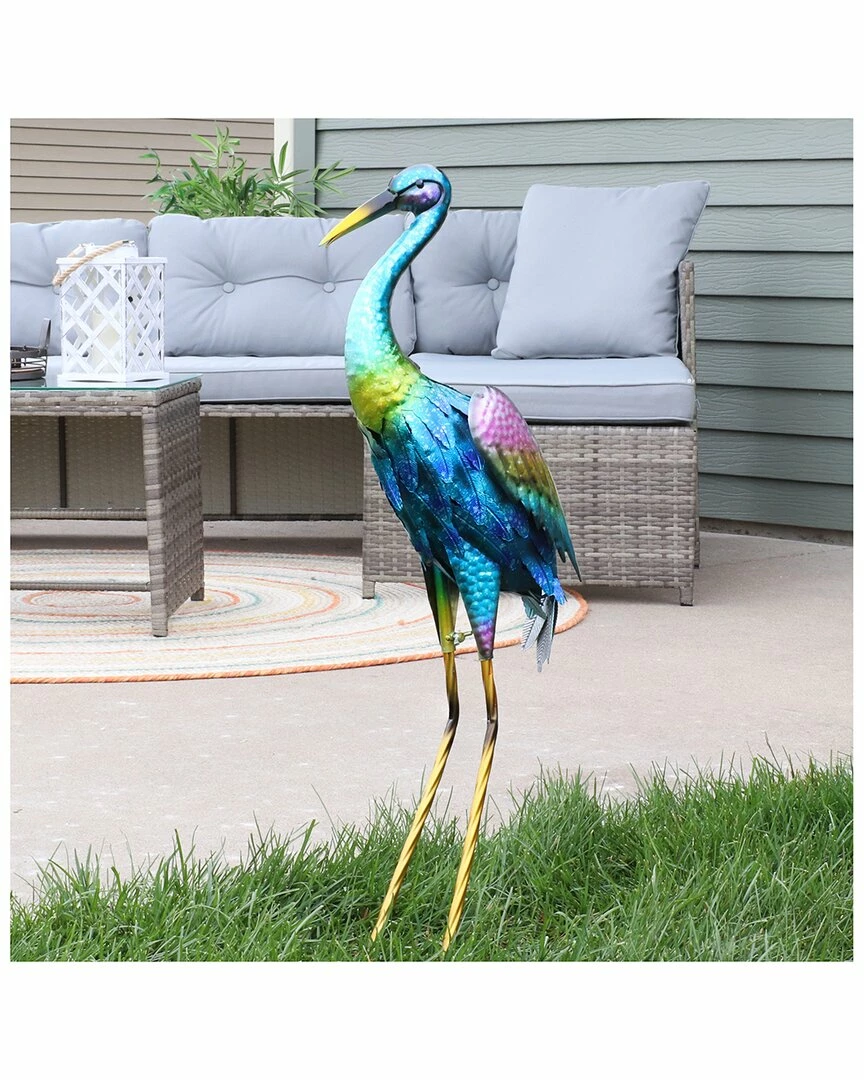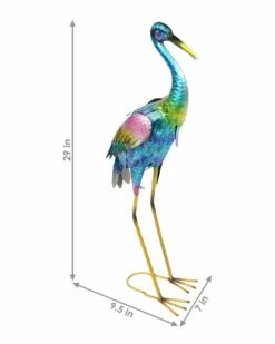 - This outdoor metal crane statue will be an instant focal point in the yard, garden, or any outdoor living space. Easy to assemble, the crane statue comes in 2 pieces that are connected via a thumbscrew and easily come apart for storage. Featuring a vibrant iridescent color scheme, the crane yard art sculpture is sure to add just the right finishing touch. The statue is designed to last with iron sheeting construction and a powder-coated finish. Next, the painted top coat ensures a long-lasting, beautiful statue to accent the yard for many seasons to come.