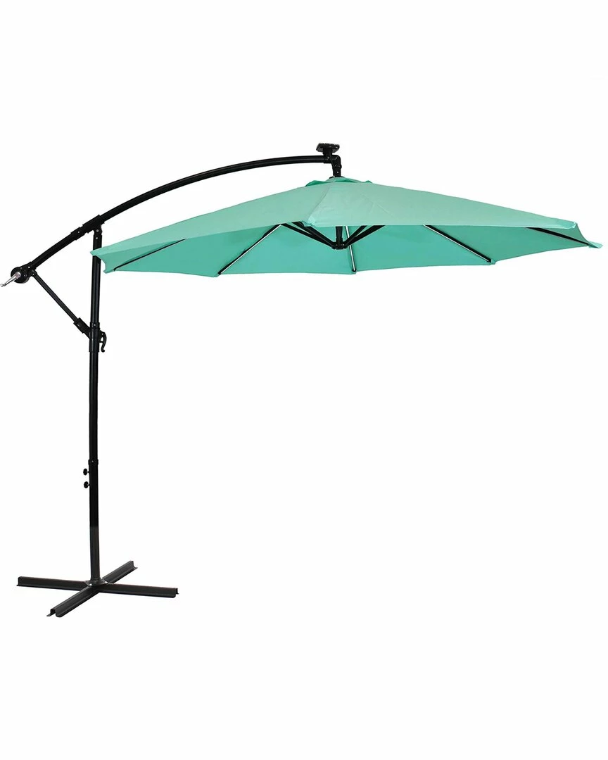- Enjoy shade during the day and gentle illumination in the evening with this Outdoor Cantilever Umbrella with Solar LED Lights from Sunnydaze Decor. Featuring a waterproof polyester umbrella canopy, this outdoor umbrella is designed to be strong enough to hold up against the elements. The umbrella is held together by a durable steel base and pole that provide a sturdy frame. This outdoor patio accessory is easy to set up and adjust with the cantilever and crank. Please note, a heavy base is necessary to place on the crossbase to keep this umbrella securely in place (not included, must be purchased separately).