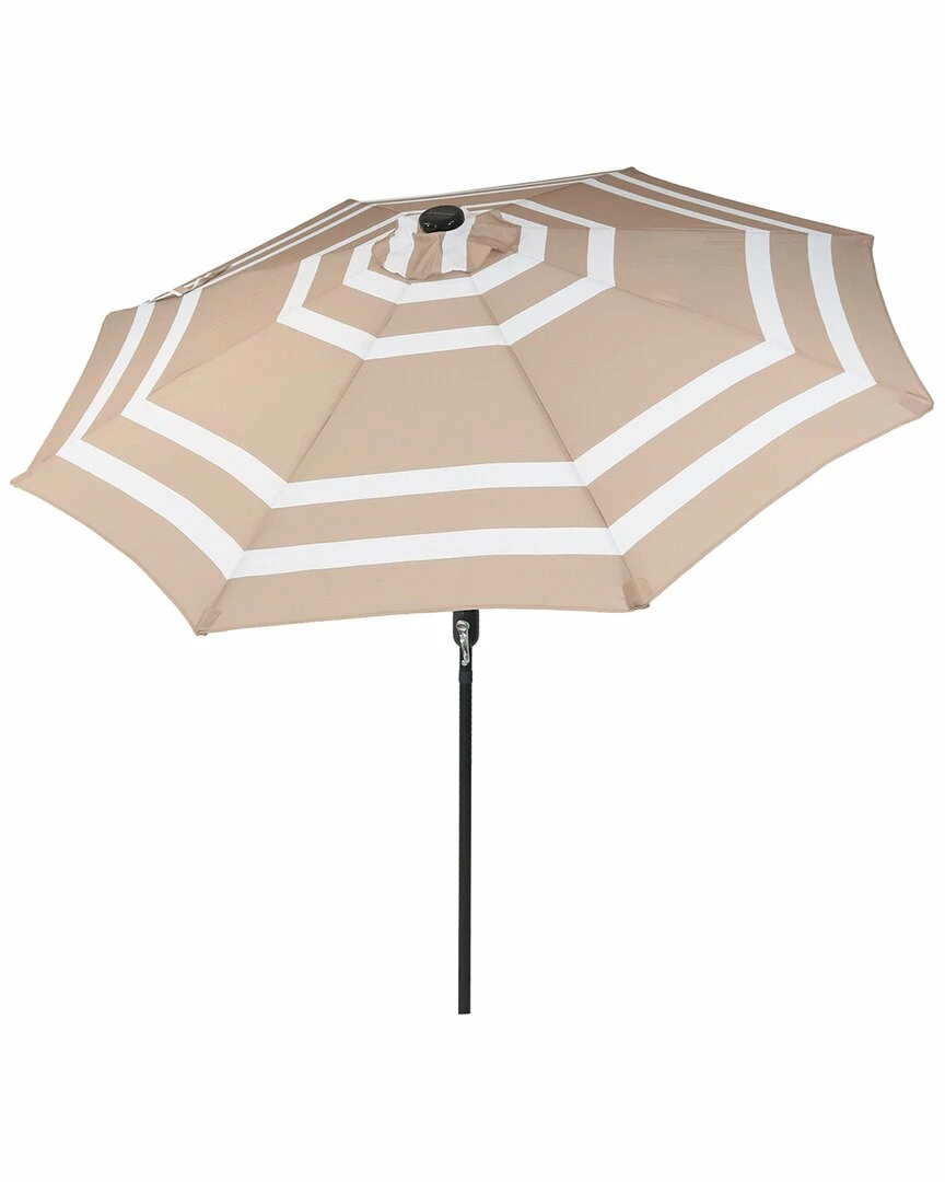 - DURABLE DESIGN: Patio umbrellas are made form sturdy 100% polyester fabric with 8 steel ribs and 3 solar power white LED lights on each rib. Metal pole is made from black powder-coated aluminum for extra support and durability.