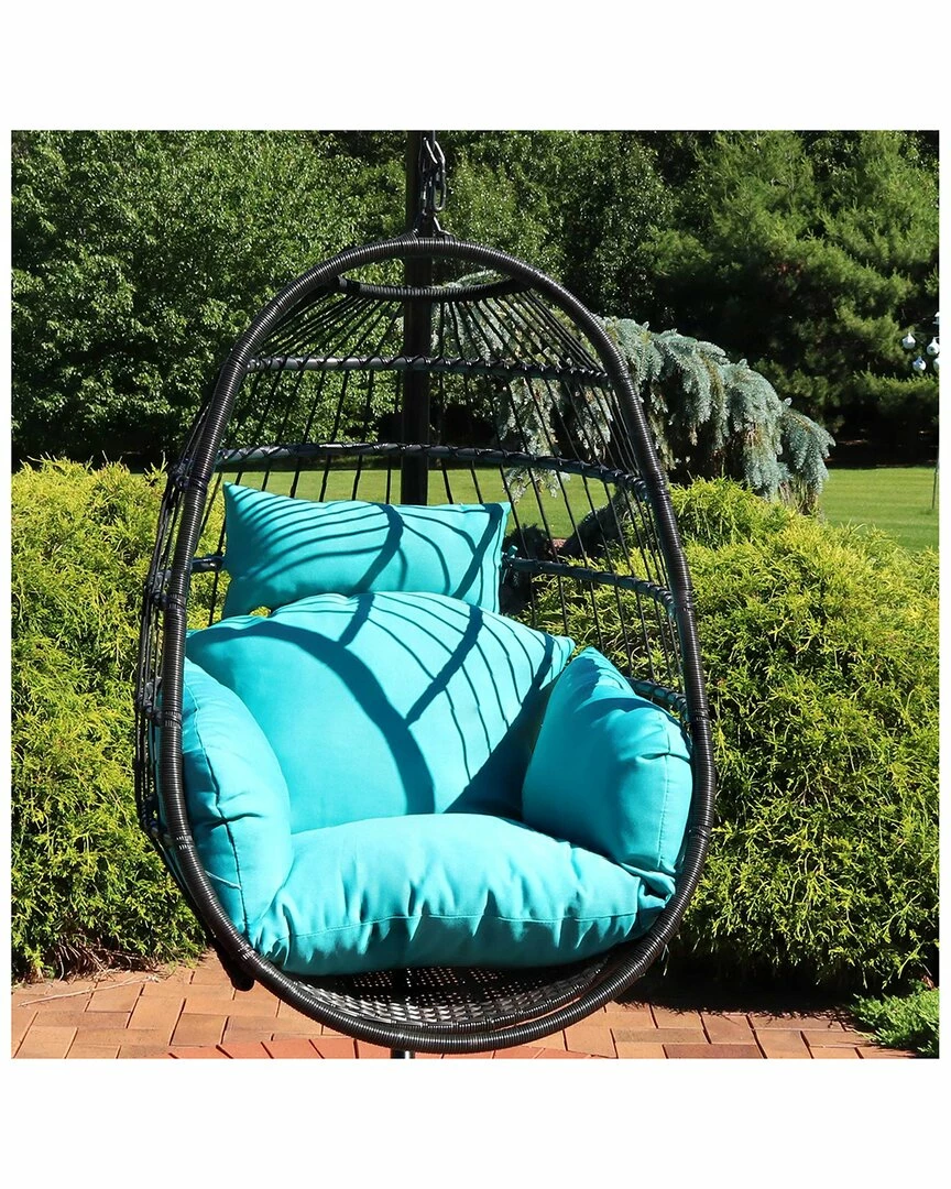 - Find the perfect place to kick back and relax with the Penelope Hanging Egg Chair with Cushions from Sunnydaze Decor. This chair features durable construction with a steel frame wrapped in weather-resistant polyethylene rattan and a nylon rope chair back. This chair is strong and sturdy, but it is also built for comfort and relaxation with a comfy polyester head rest and soft, all-in-one seat , back and arm cushion. The headrest pillow is easily tied to the frame of the chair using the attached fabric tie, and the cushion features zippers so you can simply remove the inner cushion for easy cleaning, The rattan wicker construction is also smooth to the touch so you will not have to worry about splinters. A safety strap is included to connect the chair to a stand to help keep the chair safely in place while getting in and out of the chair (stand is not included). The classic gray color of the frame and turquoise cushions will add a pop of color to any decor.