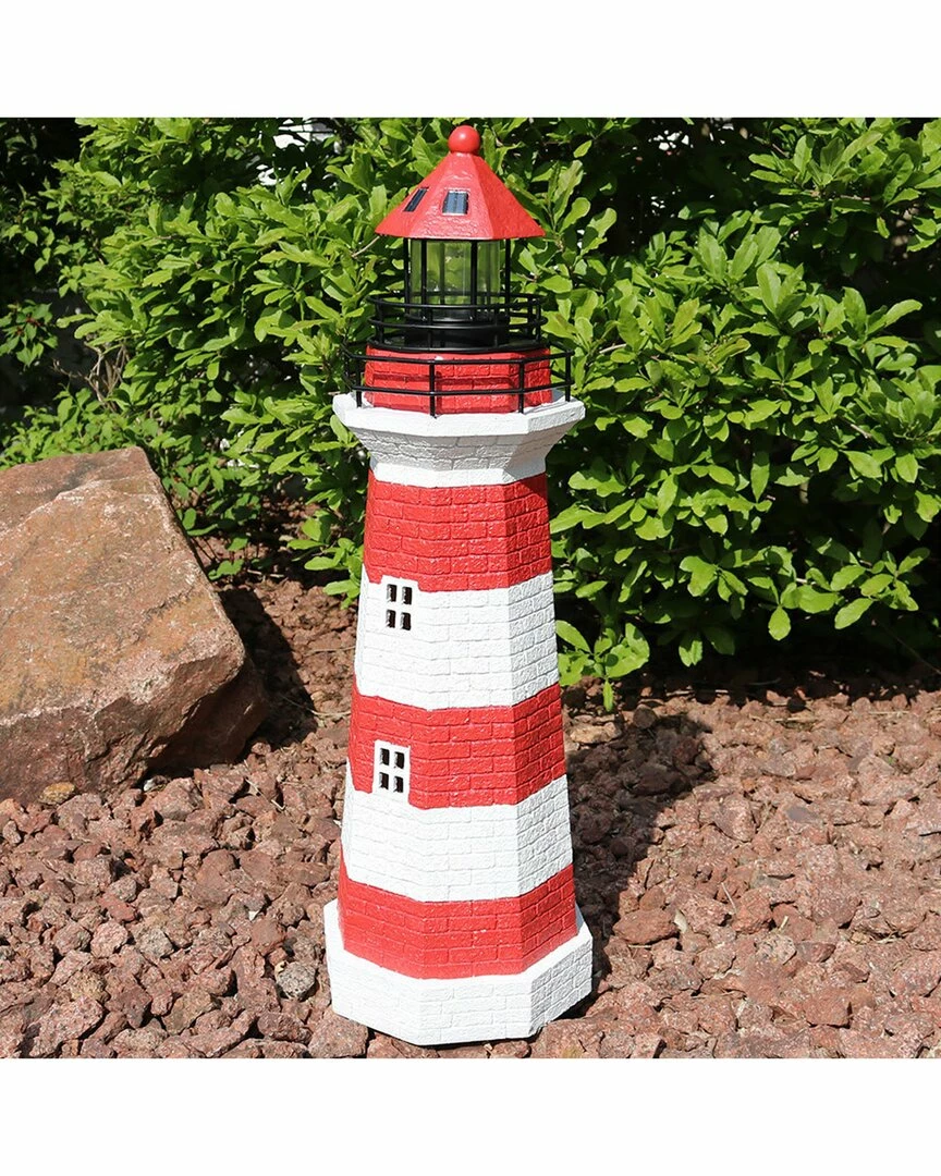 - This nautical-inspired solar LED lighthouse is sure to add charm to any backyard, patio, or other outdoor space. Featuring a durable resin-metal construction, window and door detailing as well as push-button on/off switch, this piece is built to impress and last. This decorative statue is designed to resemble a lighthouse one would find on the coast with its brick detailing and vibrant stripes. Place it anywhere it will collect direct sunlight during the day charging the batteries housed below the built-in solar panel and it will light up any landscape at night for up to 4-6 hours.