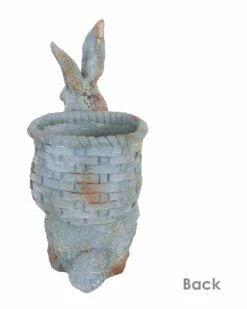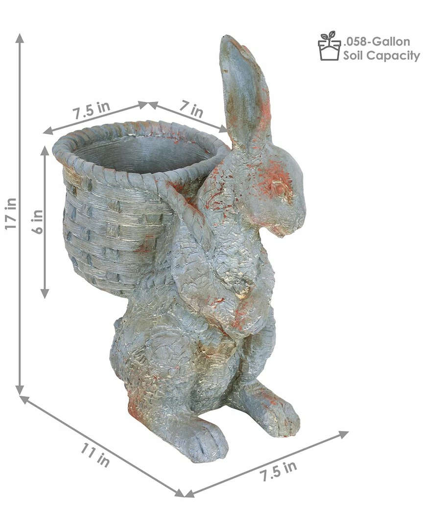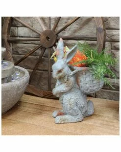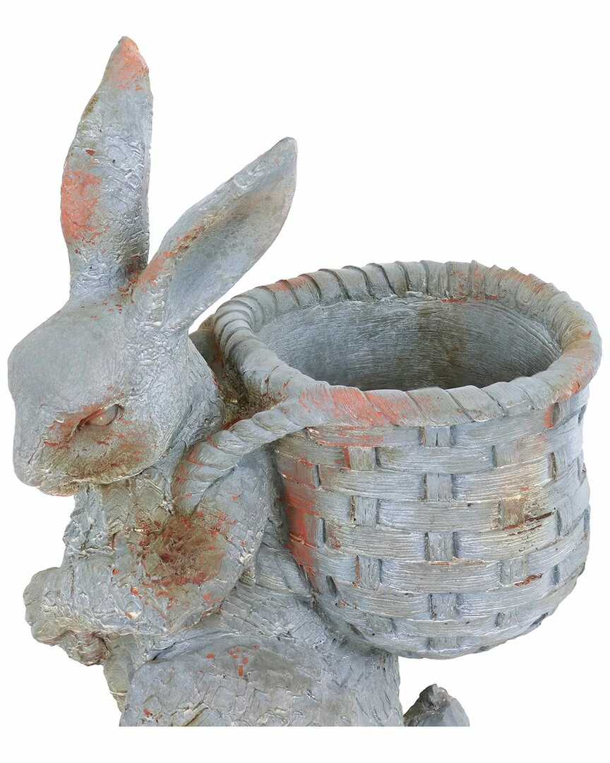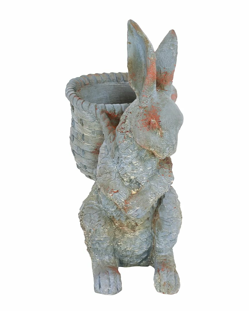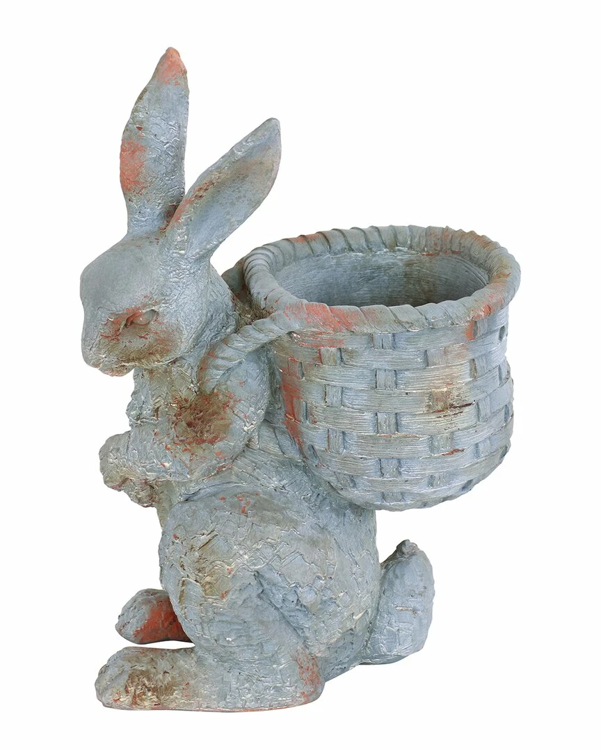 - Add whimsy to the backyard garden, patio, home, or office with Roman the rabbit statue. The figurine carries a basket on his back that can be used for flowers or other decorative accessories (although he prefers carrots). The polystone construction is a combination of stone powder and polyresin that gives the sculpture a stone-like texture that is easy to maintain and lightweight. Neutral shades of gray and brown are painted to give it an antique style that would perfectly complement any home or garden decor.