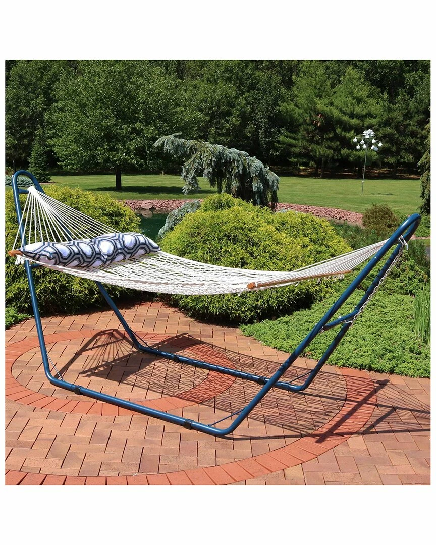 - Bring comfort and style to any outdoor space! This polyester rope hammock comes with a detachable pillow, hanging chains and spreader bars on each end so it is easy to hang it on trees or on the included matte blue steel stand. The included adjustable blue stand is perfect for several different styles of hammocks. Whether it’s a Mayan, Brazilian, camping, or spreader bar hammock, this frame will do the trick. To fit, hammocks can range from 9.5 to 14′ long. The metal stand features a sturdy 1.5″ powder-coated steel tube frame for resistance to rust, as well as adjustable chains and s-hooks, making this movable double stand perfect for any hammocks.