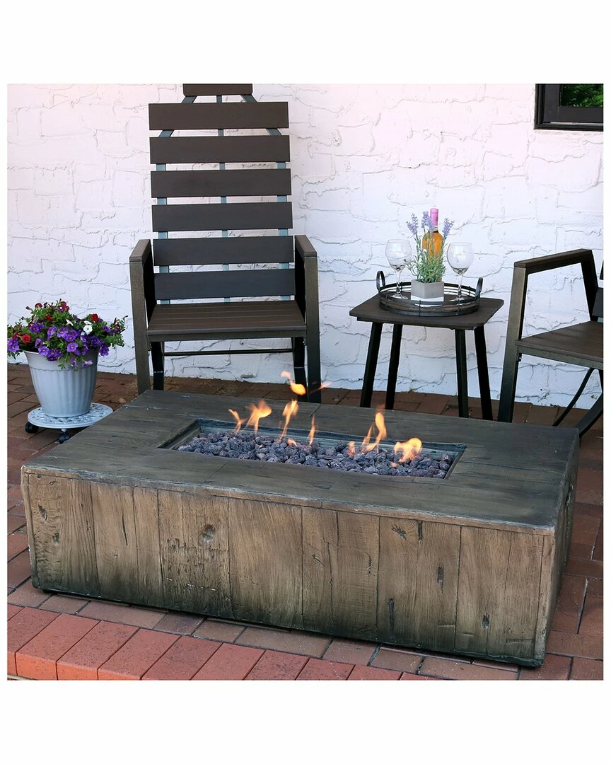 - STURDY AND WELL BUILT FOR OUTSIDE: Outside firepit table is made of fiberglass reinforced concrete for durability and fire resistance; Materials beautifully replicate the look and texture of wood; Included storage cover helps prolong the life of your gas