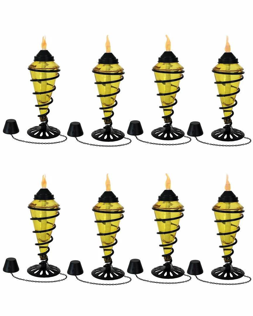 - Create a warming, decorative ambiance in any outdoor space with this set of 8 swirling glass tabletop torches by Sunnydaze Decor. Featuring vibrant coloring, these can easily add a subtle color pop to any outdoor oasis. They are a great addition to an outdoor dining space, or side tables on the patio. Each torch features an attached snuffer, so the flames can be extinguished safely and easily. Since the snuffers are tethered to the torches with a chain, there’s no need to worry about searching for or losing the snuffers. Each torch also includes a long-lasting fiberglass wick.