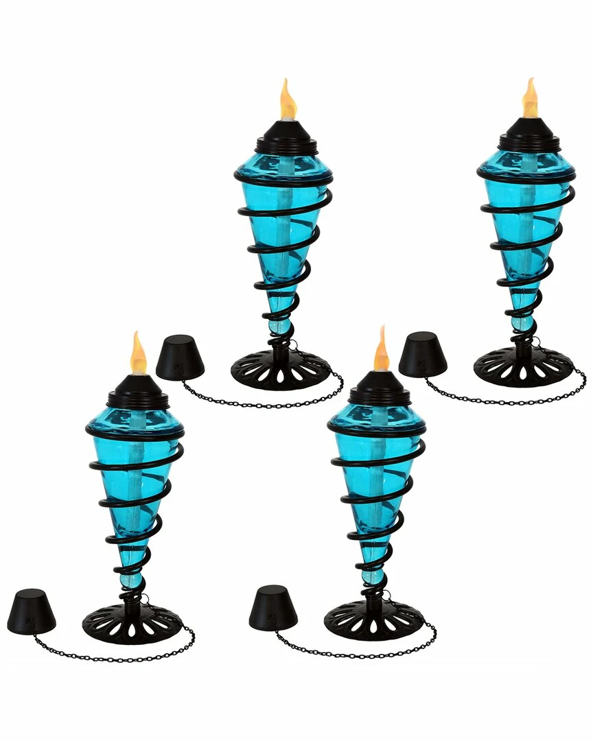- Create a warming, decorative ambiance in any outdoor space with this set of 4 swirling glass tabletop torches by Sunnydaze Decor. Featuring vibrant coloring, these can easily add a subtle color pop to any outdoor oasis. They are a great addition to an outdoor dining space, or side tables on the patio. Each torch features an attached snuffer, so the flames can be extinguished safely and easily. Since the snuffers are tethered to the torches with a chain, there’s no need to worry about searching for or losing the snuffers. Each torch also includes a long-lasting fiberglass wick.