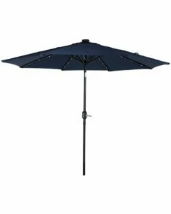 - This solar patio umbrella has everything needed to enjoy time outdoors and out of the sun. The tilt and crank functionality can conveniantly position the umbrella at the perfect angle, easily close and open it. The umbrella features a solar panel located at the top of the umbrella that powers the 24 LED lights located on the steel ribs making socializing or relaxing under the umbrella day or night much easier. The lights operate via a switch on the upper crank housing. When fully charged via solar power, the lights will last 8-10 hours! The large 9′ umbrella diameter makes it the perfect size for any 42″ – 54″ outdoor dining table and chairs. With a standard 1. 5″ opening base, use the umbrella with any favorite outdoor seat ing set. In addition, the umbrella is engineered to last with a black powder-coated aluminum pole for resistance to rust, steel ribs for maximum support and 100% polyester fabric for the umbrella for extra durability.