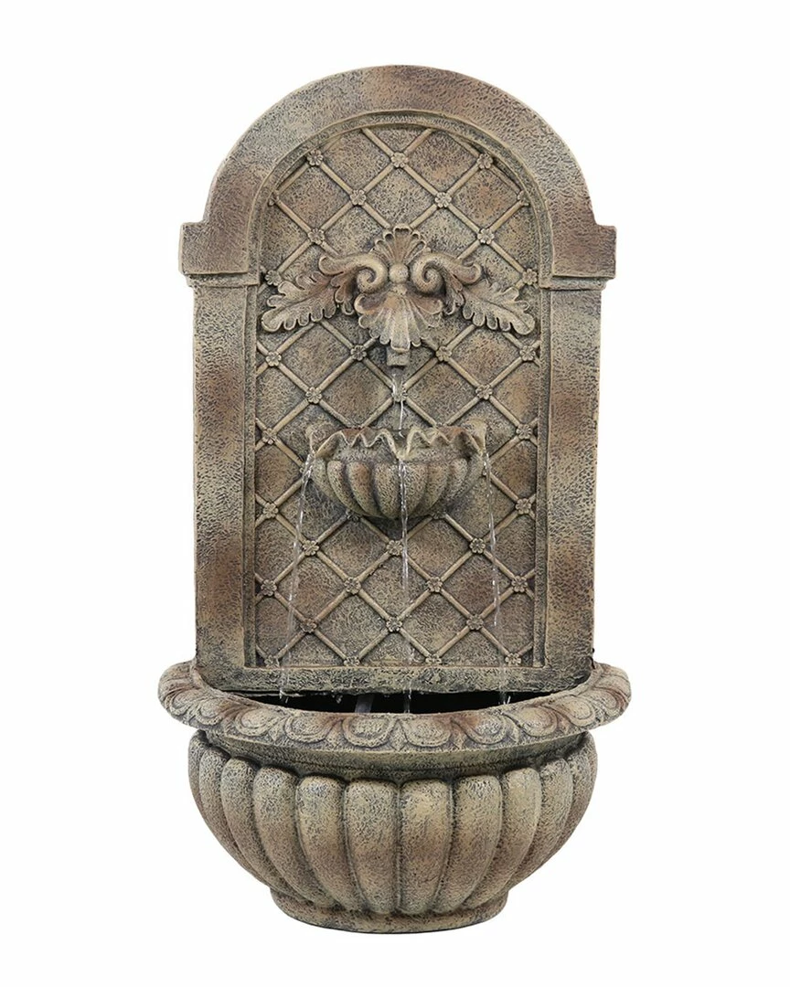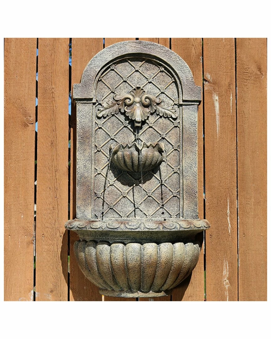 - Bring the look of Mexico to the garden, on the patio or in the yard with this colonial style outdoor solar with battery backup wall fountain. Lightweight enough to be mounted by one person, but durable enough to last for years. The cream Florentine finish is a nice fit for most natural color schemes. No more unsightly extension cords running across the yard and hogging outdoor plugins. Mount and conceal the solar panel in a sunny place and enjoy! The rechargeable battery pack charges throughout the day (with or without the fountain running) so the fountain can be enjoyed in the evening as well.