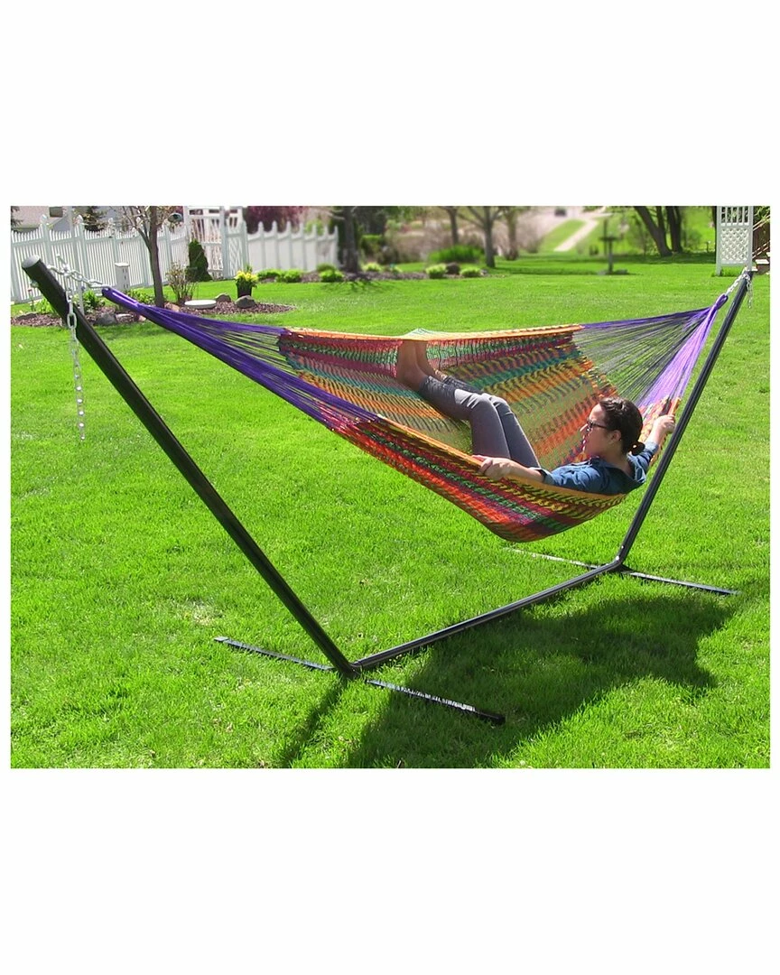 - Reach ultimate relaxation and comfort in this large hammock. Made in Mexico, these thick cord Mayan hammocks are handwoven, each is unique and made to last. This hammock and stand combination includes a multi-color hammock, 2 hanging chains and 15′ stand. Every hammock is different and multi-colored.